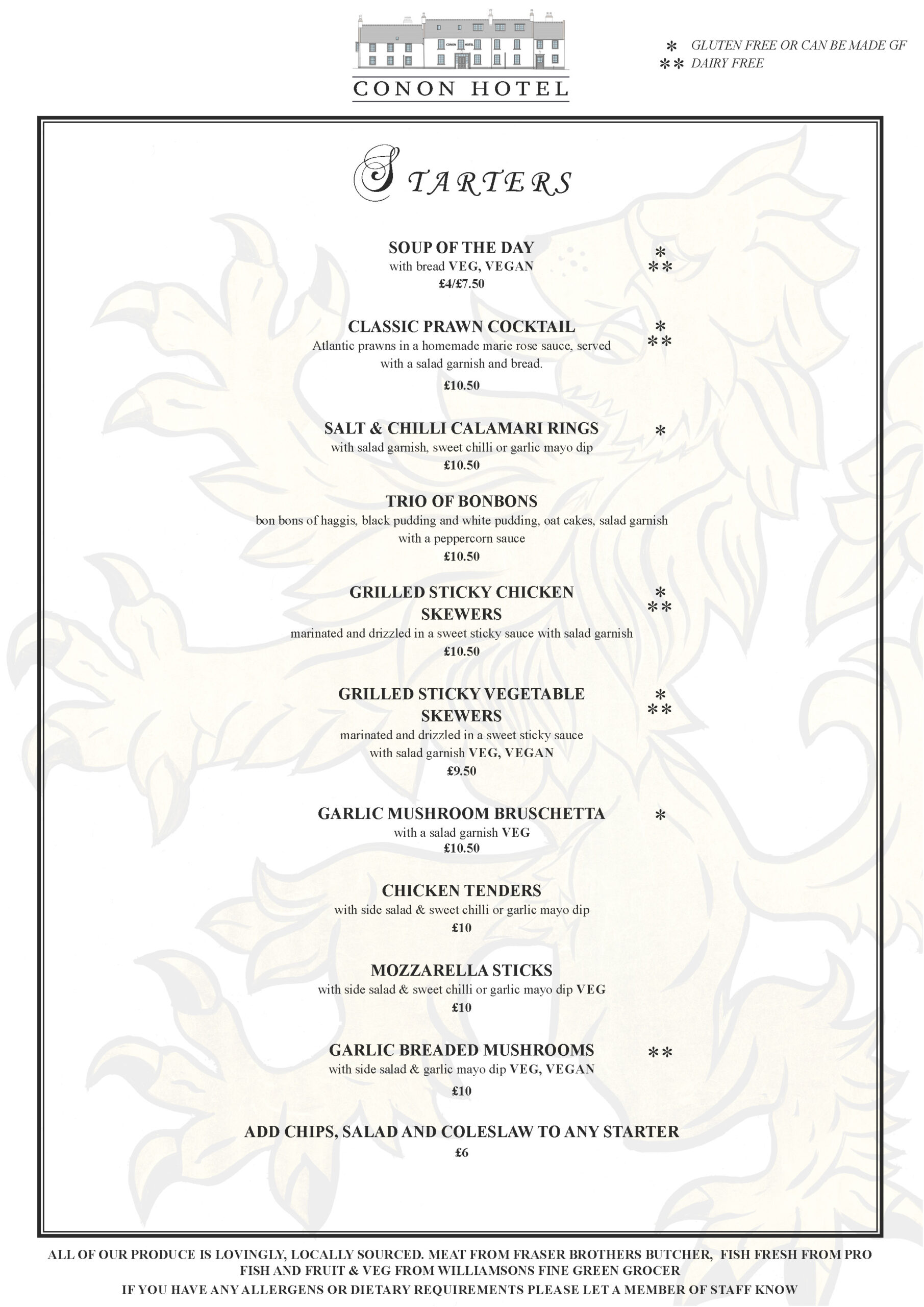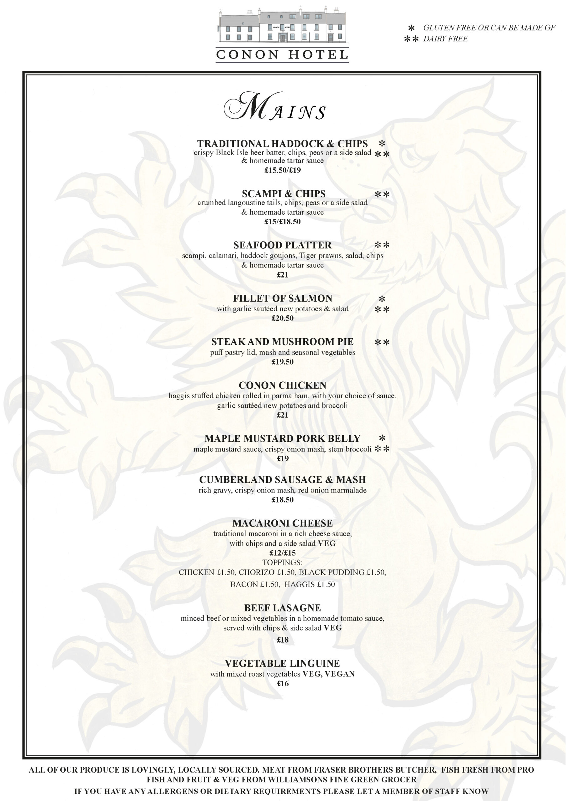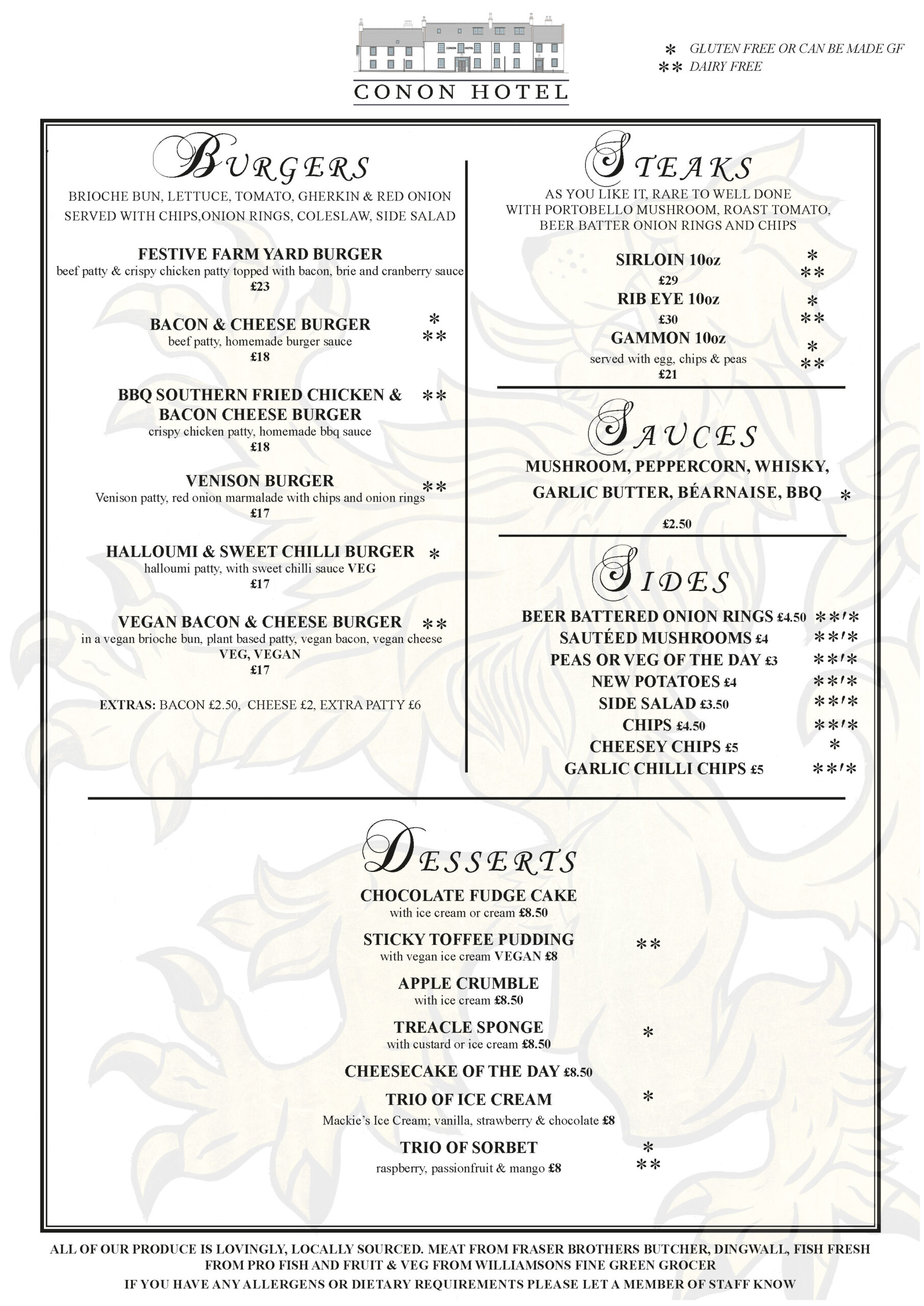 Our meat comes from the famous, multi-award-winning Fraser Brothers butchers in Dingwall High Street, established in 1888 – holders of the titles “North of Scotland Haggis Champion”, “Scottish Black Pudding Champion” and “North of Scotland Beef Champion”, to name but a few.