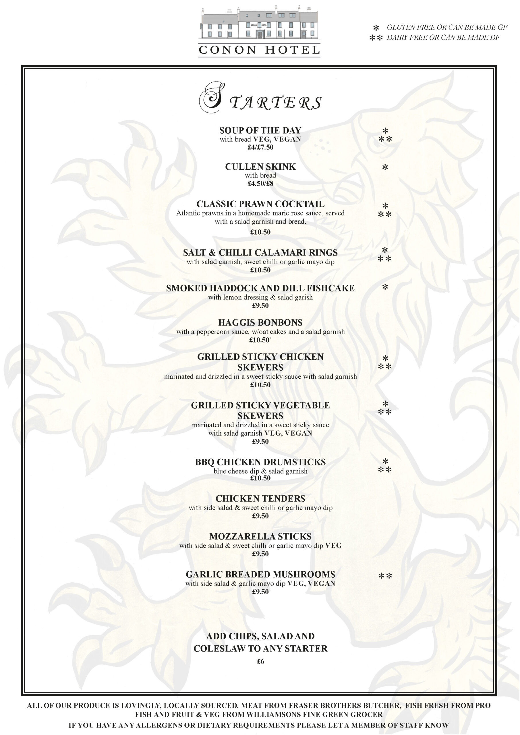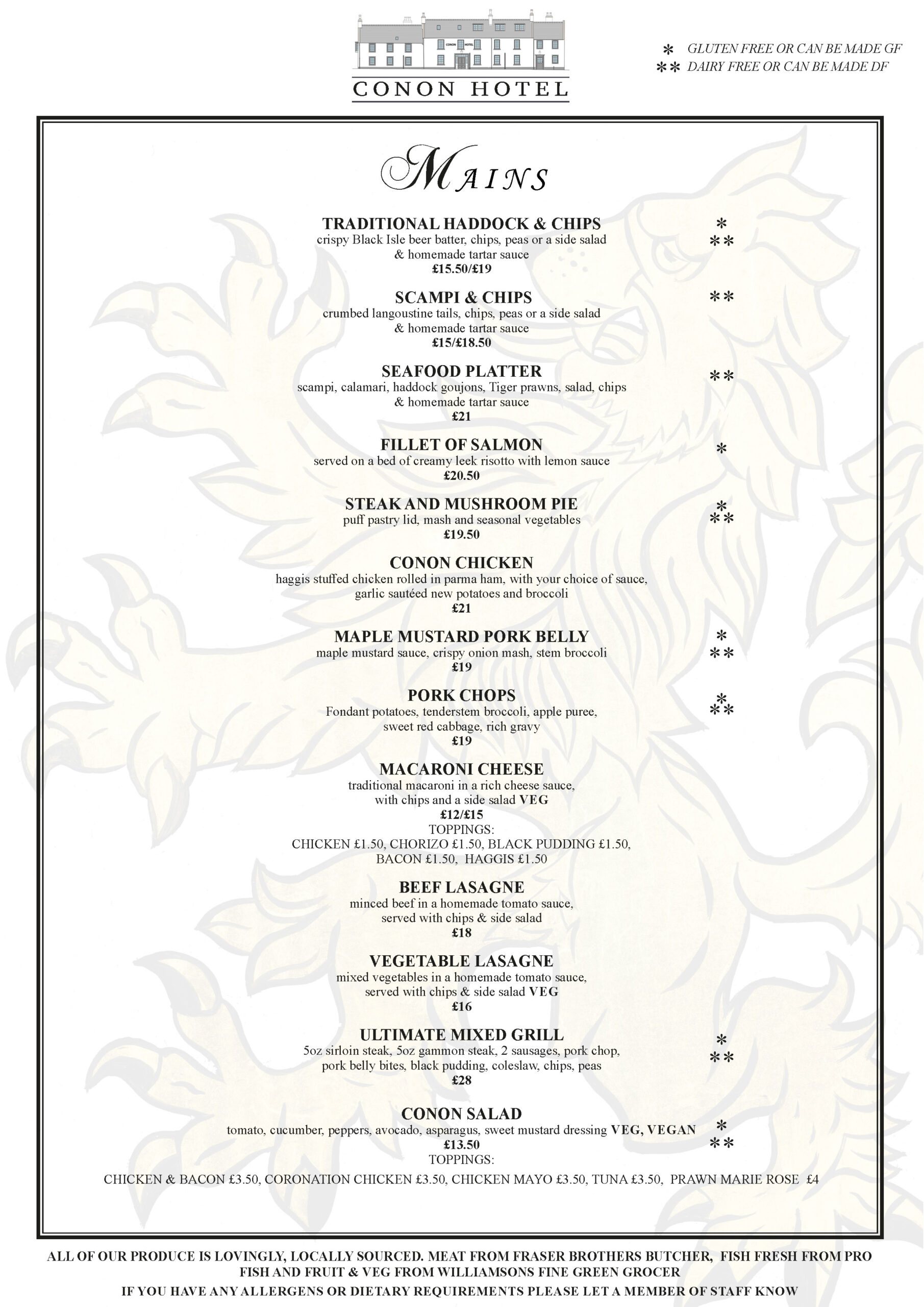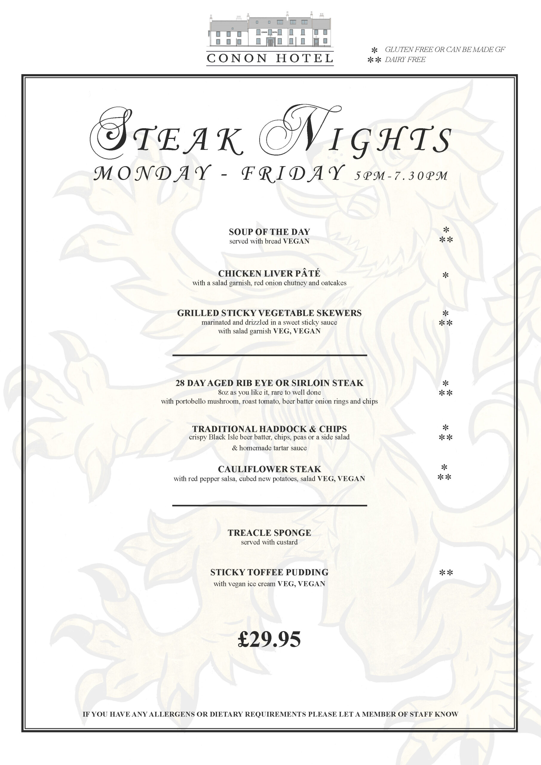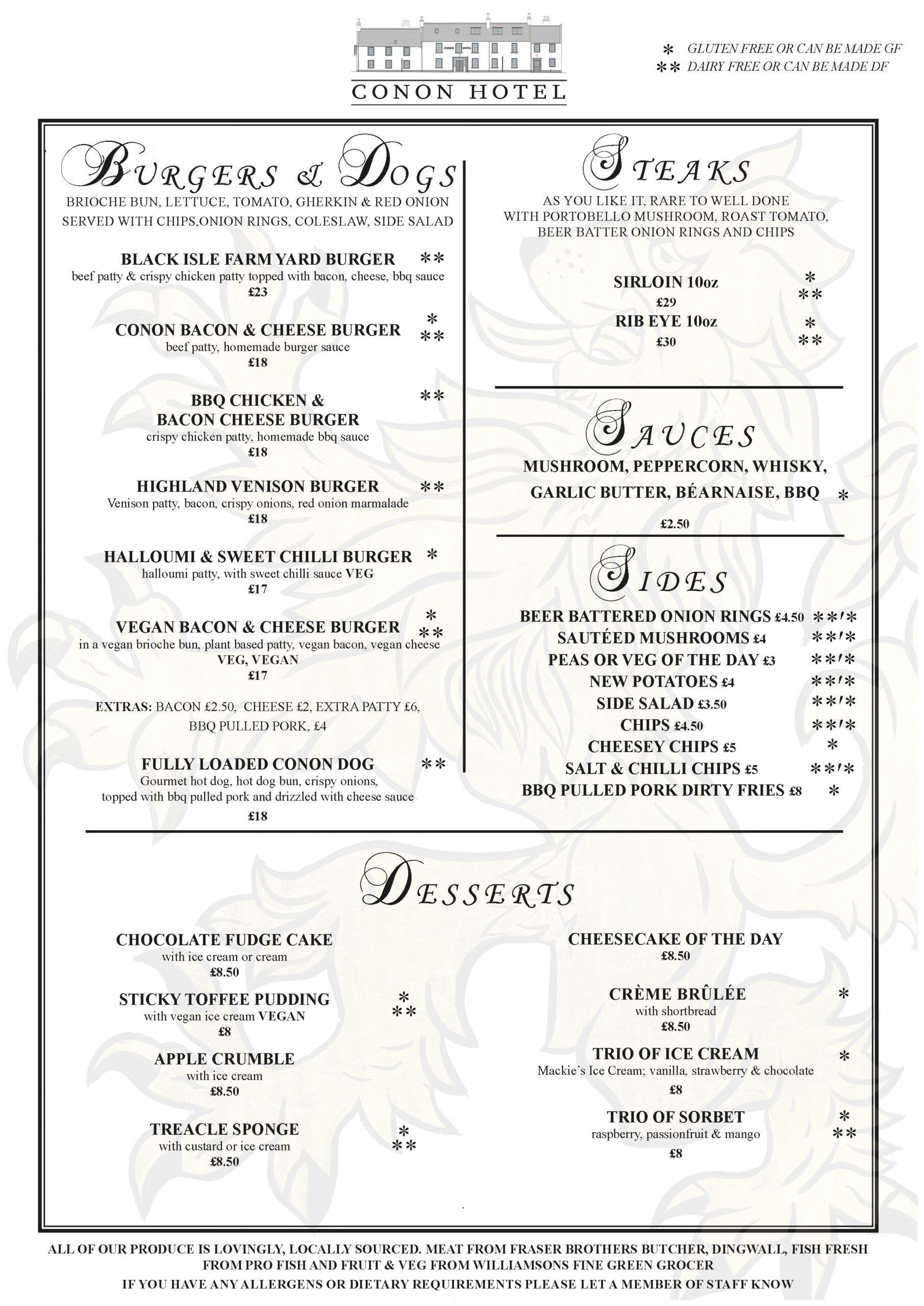Our meat comes from the famous, multi-award-winning Fraser Brothers butchers in Dingwall High Street, established in 1888 – holders of the titles “North of Scotland Haggis Champion”, “Scottish Black Pudding Champion” and “North of Scotland Beef Champion”, to name but a few.